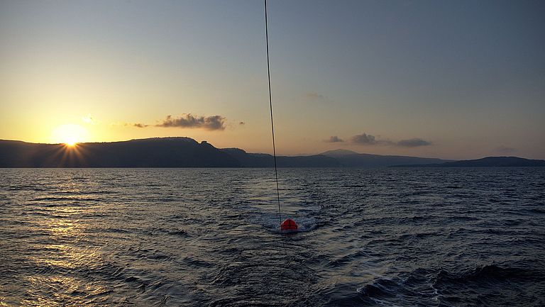 Seismische Messungen während der Expedition POS538 vor Santorini. Der Auftriebskörper markiert die Position der seismischen Quelle. Foto: Jonas Preine