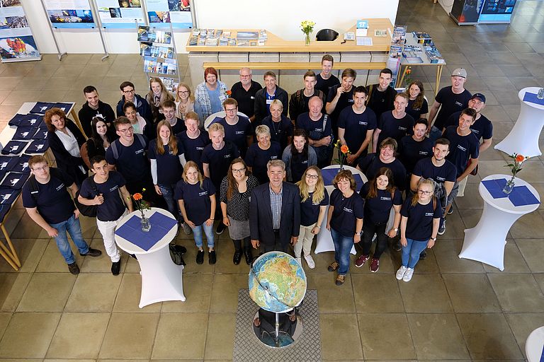 01.09.2017/Kiel. Mehr als 30 Auszubildende vom Helmholtz-Zentrum Geesthacht (HZG) statteten dem GEOMAR heute einen Besuch ab. Nach einer Begrüßung durch den Verwaltungsdirektor des GEOMAR, Michael Wagner, und einer Übersicht über das GEOMAR und seinen Forschungsthemen, bekamen die Berufsanfänger einen Einblick in das Technik- und Logistikzentrum des GEOMAR. Der wissenschaftliche Leiter, Dr. Peter Linke und Ausbildungsleiter Sven Sturm stellten die zentrale Einrichtung vor. Neben innovativer Meerestechnik und Großgeräten bildeten die Werkstätten des GEOMAR einen weiteren Schwerpunkt des Besuchs. Im Anschluss gab es noch Gelegenheit sich mit den Auszubildenden des GEOMAR weiter auszutauschen. Verwaltungsdirektor Michael Wagner: "Die betriebliche Ausbildung ist für den nicht-wissenschaftlichen Teil der Forschungseinrichtungen von wachsender Bedeutung. Hier können wir uns qualifizierte Fachkräfte nach unseren Bedürfnissen ausbilden, die sonst auf dem freien Markt nur schwer zu rekrutieren sind. Verglichen mit dem HZG hat das GEOMAR hier noch Nachholbedarf. In den vergangenen Jahren haben wir aber unsere Anstrengungen in diesem Bereich erheblich gesteigert", so der Verwaltungsdirektor des GEOMAR.