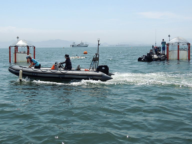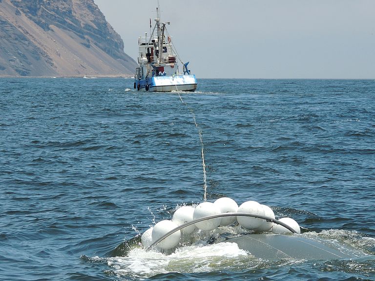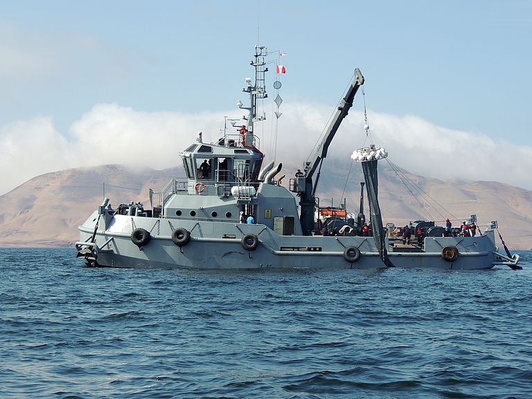 Das komplexe System haben Wissenschaftlerinnen und Wissenschaftler vor der Küste Perus in „Riesen-Reagenzgläsern“ eingefangen: In einem Experiment mit den KOSMOS-Mesokosmen (KOSMOS: Kiel Off-Shore Mesocosms for Ocean Simulations) beobachten sie, wie der natürliche Auftrieb von nährstoffreichem Tiefenwasser die Produktivität des Planktons und Stoff-Flüsse in der Sauerstoffminimumzone beeinflusst. Unter Leitung des GEOMAR Helmholtz-Zentrum für Ozeanforschung Kiel hat sich ein Team aus 23 peruanischen sowie 49 chilenischen, ecuadorianischen, brasilianischen, US-amerikanischen, australischen, spanischen, finnischen, österreichischen und deutschen Forschenden nahe der Hafenstadt Callao eingerichtet. Neben dem Institut IMARPE (Instituto del Mar del Perú) unterstützen lokale Behörden und die peruanische Marine sowie das Forschungsschiff HUMBOLDT und der Marine-Schlepper MORALES die Studie, die im Rahmen des Kieler Sonderforschungsbereichs (SFB) 754 „Klima – Biogeochemische Wechselwirkungen im tropischen Ozean“ stattfindet.