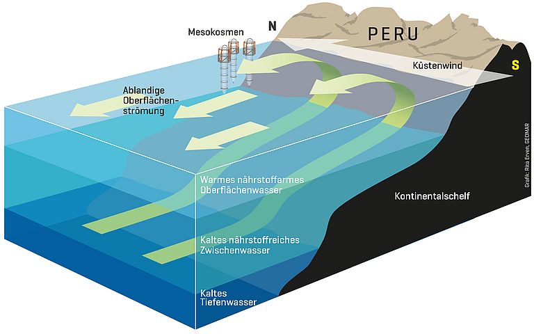 Entlang der Westküste Südamerikas erstreckt sich eine der produktivsten und artenreichsten Meeresregionen der Welt. Der Humboldtstrom versorgt die Küsten Perus und Nordchiles mit kaltem und nährstoffreichem Wasser. Es steigt am Kontinentalhang zur lichtdurchfluteten Oberfläche auf und begünstigt so das Wachstum von Plankton – wovon wiederum Fische und andere Meereslebewesen profitieren. Doch gleichzeitig ist Sauerstoff in der Region knapp. Die Sauerstoffminimumzone dehnt sich sogar noch weiter aus, wenn sich durch den Klimawandel Temperatur und Schichtung des Wassers sowie Strömungsverhältnisse ändern. Bei Sauerstoffmangel verbrauchen Bakterien im Wasser gelösten Stickstoff für ihre Stoffwechselprozesse – genau den Nährstoff, der das Planktonwachstum begrenzt. So sinkt die Produktivität, obwohl der Humboldtstrom reichlich andere Nährstoffe liefert.