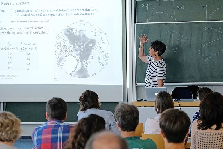 Prof. Dr. Anya Waite, Leiterin der Sektion Polarbiologische Ozeanographie des Alfred-Wegener-Instituts Helmholtz-Zentrum für Polar- und Meeresforschung (AWI), untersucht das aktuelle Verständnis neuer N-Flüsse in die Arktis und innerhalb der Arktis. Sie und ihre Gruppe bewerten das Potenzial für neue physikalische und biogeochemische Daten, um Schätzungen der aktuellen und zukünftigen Stickstoff-Flüsse einzuschränken. In dieser Woche stellte sie im Rahmen der Marie-Tharp-Vortragsreihe am GEOMAR relevante Stickstoffeinträge vor, darunter N2-Fixierung, Doppeldiffusion, turbulente Vermischung, Remineralisierung von allochthonem gelöstem organischem Material und submesoskalige und mesoskalige Prozesse. Den Zuhörerinnen und Zuhörern stellte sie dabei die Arbeit ihrer Gruppe vor, die die Skalen identifiziert, in denen die physikalisch-biogeochemische Kopplung für die N-Injektion und den Export von neuem Stickstoff in und aus der euphotischen Zone besonders wichtig ist.