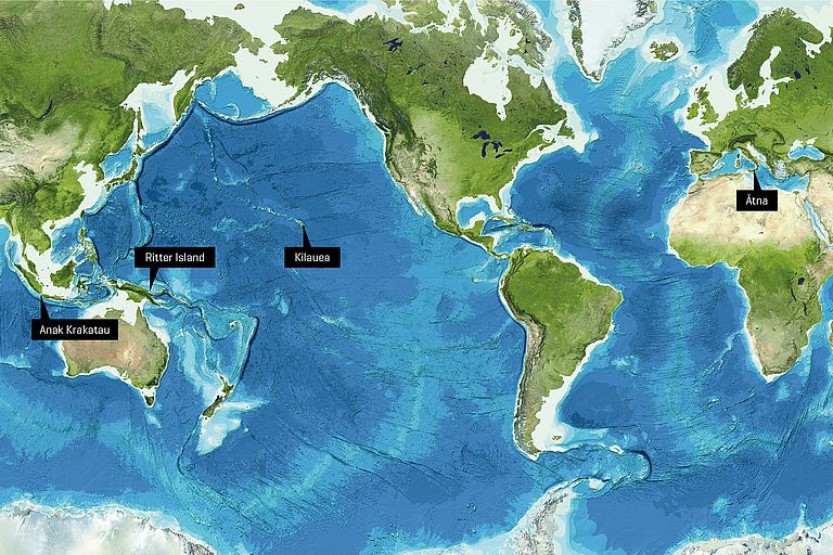 Im Fokus des Projekts werden die Vulkane Ätna (Italien), Anak Krakatau (Indonesien), Ritter Island (Papua-Neuguinea) und Kilauea (Hawaii, USA) stehen. Messungen vor Ort, numerische Modelle und Laborexperimente an Vulkangesteinen werden zusammen neue Erkenntnisse darüber ermöglichen, welche Mechanismen große Flankenzusammenbrüche auslösen. Auch die im Herbst 2020 am Ätna ausgebrachten Messgeräte tragen wichtige Daten zum Projekt bei. „Es handelt sich um Sensoren aus dem GeoSEA-Programm am GEOMAR. Sie messen sehr präzise über weite Entfernungen unter Wasser den Abstand zueinander und geben so Auskunft über Bewegungen des Untergrundes“, erklärt Morelia Urlaub.
