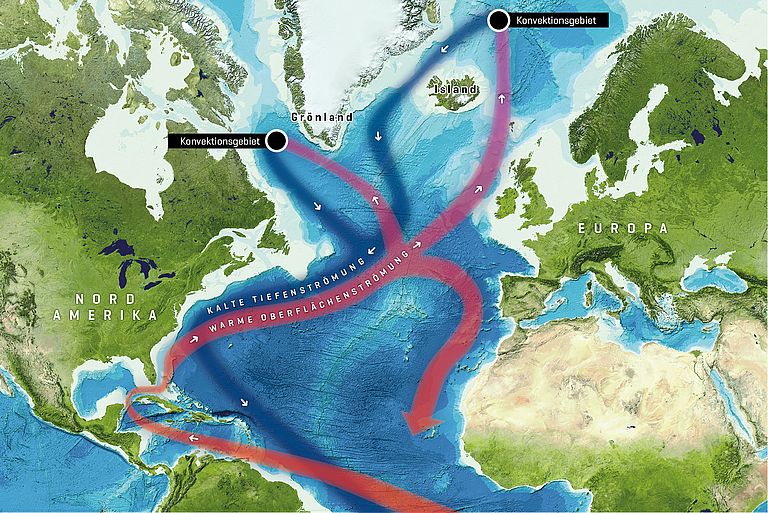 Die Golfstromzirkulation ist die Warmwasserheizung Nordeuropas. Ohne die permanente Zufuhr warmen Wassers wäre das Klima in diesen Breiten eher subpolar wie beispielsweise auf der anderen Seite des Atlantiks in Labrador. Der Antrieb der Golfstromzirkulation ist die Tiefenkonvektion, das Absinken abgekühlter Wassermassen in den hohen Breiten bis in große Tiefen. Die damit verbundene Sogwirkung lässt tropisches Wasser in den oberen Meeresschichten nach Norden fließen. Man spricht in diesem Zusammenhang auch vom atlantischen Förderband. Das Stromsystem könnte sich infolge der Erderwärmung abschwächen, auch ohne das Schmelzen des grönländischen Eispanzers. Das liegt einerseits an der Erwärmung selbst und andererseits an geringeren Salzgehalten infolge höherer Niederschläge. Beide Effekte lassen die Dichte des Meerwassers sinken, was die Tiefenkonvektion erschwert.
