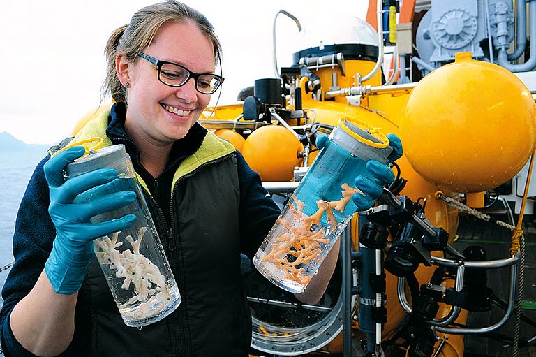 Zusätzlich untersucht sie Korallen regelmäßig in ihrer natürlichen Umgebung. Erst im Juli stattete sie den Riffen Sula, Nord-Leksa, Hola und Steinavaer in Norwegen mit dem Forschungsschiff POSEIDON und dem Tauchboot JAGO Besuche ab. Dort prüfte sie den Zustand der Korallen, maß ihren Sauerstoffverbrauch und verglich verschiedene Parameter mit den Erkenntnissen aus dem Labor in Kiel. Einige Korallen kamen auch wieder mit ans GEOMAR. Hier sollen weitere Eigenschaften wie Reproduktion, Genetik oder Isotopie untersucht werden. „Insgesamt deuten unsere bisherigen Ergebnisse darauf hin, dass die Kaltwasserkorallen besser mit dem Klimawandel zurechtkommen könnten als erwartet", fasst Büscher zusammen. Das gilt allerdings nur für lebende Korallen. Die unteren Schichten der Riffe bestehen natürlicherweise aus den Skeletten abgestorbener Korallen. Diese können sich nicht mehr anpassen, ihr Kalkskelett löst sich bei zunehmender Versauerung auf. „Dann könnte im schlimmsten Fall das ganze Riff zusammenbrechen", erklärt Büscher. Und auch die lebenden Korallen kostet die Anpassung viel Kraft, die dann möglicherweise für andere Aufgaben wie Fortpflanzung fehlt. Auch bei Kaltwasserkorallen gilt daher: Entwarnung ist nicht in Sicht.