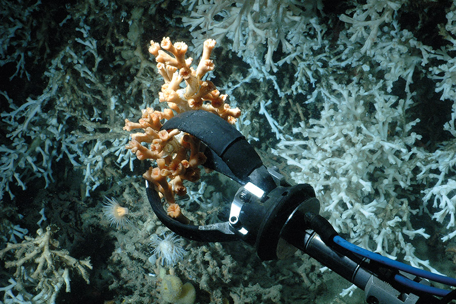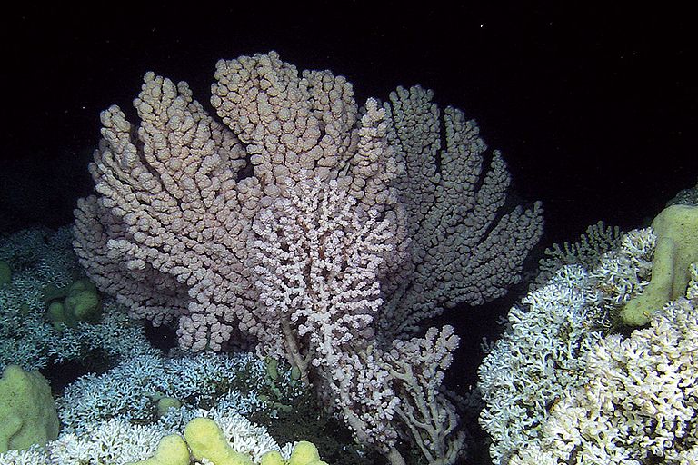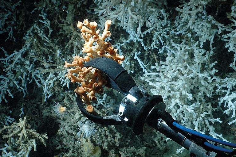 Parallel zu den Untersuchungen an tropischen Korallen begannen sich Forscherinnen und Forscher in Kiel Mitte der 1990er Jahre auch für Kaltwasserkorallen zu interessieren. Da die Riffe in deutlich größerer Tiefe existieren, waren sie lange nur Fischern bekannt, die hin und wieder abgerissene Korallenstöcke in ihren Netzen hatten. Hier galt es also Entdeckerarbeit zu leisten: Wo kommen Kaltwasserkorallenriffe überhaupt vor? Heute sind Riffe von der Küste Mauretaniens entlang der europäischen Schelfkante bis hin nach Nordnorwegen, aber auch im Golf von Mexiko bekannt. An den Schelfkanten bilden sie teilweise gewaltige Strukturen. In der Porcupine Seabight, einer untermeerischen Bucht westlich von Irland, erreichen von Kaltwasserkorallen gebildete Karbonathügel an ihrer Basis einen Durchmesser von 100 bis 1.800 Metern und eine Höhe von bis zu 350 Metern über dem Meeresboden. Das Røst-Riff vor Norwegen bedeckt gar eine Fläche von 130 Quadratkilometern. „Lange war völlig unklar, warum die Kaltwasserkorallen nur an bestimmten Stellen und in bestimmten Tiefen wachsen. Mittlerweile wissen wir, dass sie an einer speziellen Dichteschicht des Wassers siedeln, auf der ihnen genug Nährstoffe zugeführt werden", erklärt der Paläoozeanograph Dr. Sascha Flögel. Über Jahrmillionen entschied das Auf und Ab dieser Wohlfühlzone darüber, ob die Korallen wachsen konnten oder nicht. „Da Wassertemperaturen eine Rolle für die Dichte spielen, könnte eine Erwärmung des Meerwassers das Korallenwachstum in Zukunft also deutlich beeinflussen", ergänzt Flögel. Da die Kaltwasserkorallen viel schwieriger zu erreichen sind als die tropischen Korallen, führte dieser Forschungszweig auch zu einem erheblichen Schub bei der Entwicklung von Unterwassertechnologien. „Ein großer Teil unserer Tiefsee-Infrastruktur geht ursprünglich auf den Wunsch der Wissenschaft zurück, die Umweltbedingungen rund um Korallenriffe detaillierter nachvollziehen zu können", erklärt Dr. Flögel, der selbst mittlerweile schwerpunktmäßig die Entwicklung des Tiefsee-Crawler-System MANSIO/VIATOR vorantreibt.