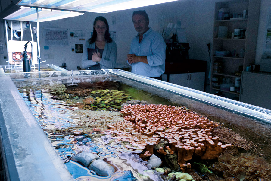 Die Arbeitsgruppe um den Geochemiker Prof. Dr. Anton Eisenhauer hat in den Räumen des GEOMAR ein künstliches Korallenriff etabliert. „Die Artenzusammensetzung, die Lichtverhältnisse, die Temperaturen, der Säuregrad, Calcium- und Carbonatgehalt, und die im Wasser gelösten Nährstoffe und Spurenelemente sind streng vorgegeben und entsprechen den Verhältnissen im Golf von Akaba", erklärt Professor Eisenhauer. Fast ein Jahr lang hat das Team Einstellungen und Techniken ausprobiert, bis es den Korallen sichtlich gut ging und sie sich vermehrten. Krebse, Schnecken, Garnelen und Fische, die das Riff sauber und unerwünschte Bewohner im Zaum halten, vervollständigen das kleine Ökosystem.