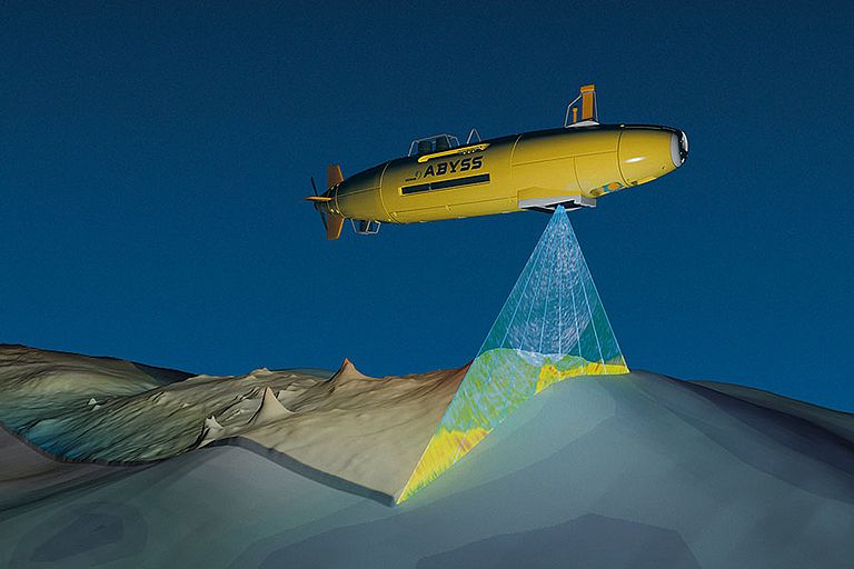 Zunehmend nutzen Forscherinnen und Forscher auch autonom agierende Fahrzeuge und Roboter, um die Ozeane und die Meeresböden zu kartieren. Vor allem, wenn die schiffsgestützte Vermessung mit einer Auflösung von etwa 100 Metern für spezielle Fragestellungen nicht mehr ausreicht, kommen mit Echoloten ausgestattete AUVs (Autonomous Underwater Vehicle) zum Einsatz. Das GEOMAR nutzt dafür seit 2008 das AUV ABYSS, das bis in 6000 Meter Wassertiefe eingesetzt werden kann. Je nach Flughöhe über dem Meeresboden kann sein Multibeamecholot Karten mit einer Auflösung von bis zehn Zentimetern erstellen. Seit 2008 hat es so entlang einer Strecke von 9300 Kilometern 730  Quadratkilometer Meeresboden vermessen. Noch genauer ist die fotografische Vermessung des Meeresbodens aus ganz geringer Höhe. Speziell dafür verfügt das GEOMAR neuerdings über die AUVs ANTON und LUISE. Der Nachteil: Je höher die Auflösung, desto kleiner ist die Fläche, die in einer bestimmten Zeit vermessen werden kann. Visualisierung: Tom Kwasnitschka / GEOMAR