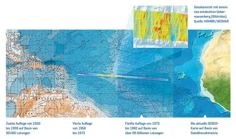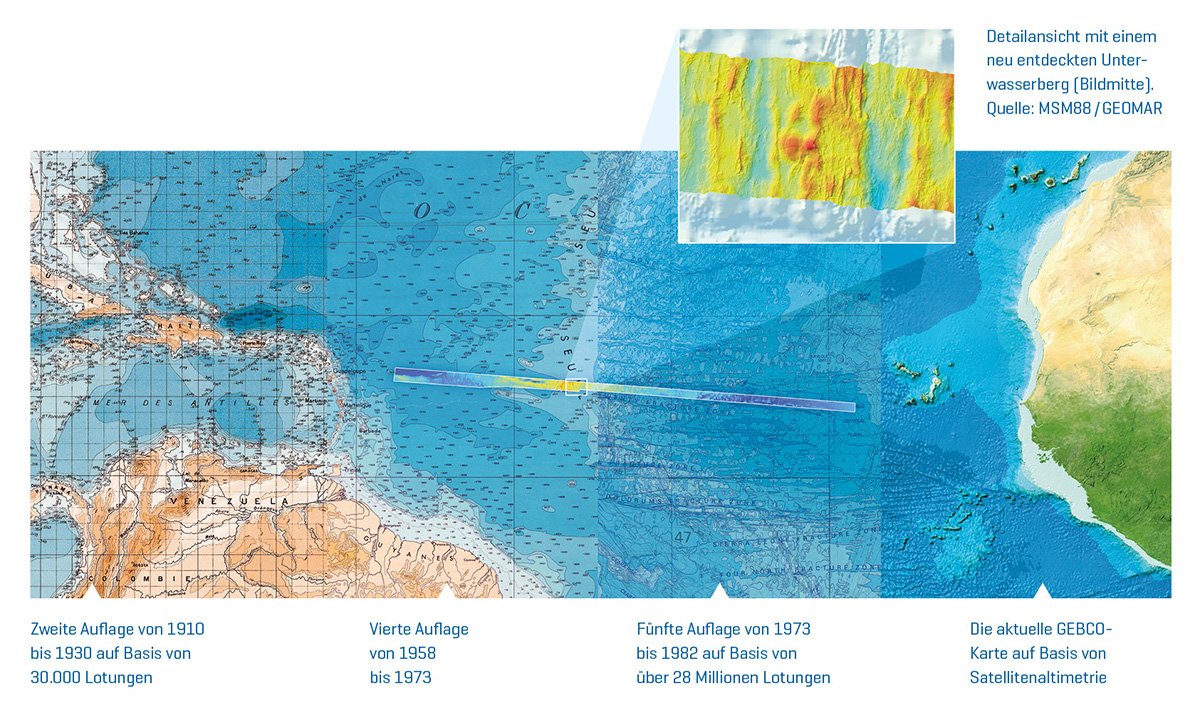 Die Entwicklung der GEBCO-Karten am Beispiel des südlichen Nordatlantiks. Der Streifen in der Mitte kennzeichnet den von den Expeditionen MSM 88/1 und 88/2 kartierten Meeresboden. Die insgesamt erfasste Fläche auf den 11 gefahrenen Profilen zwischen den Kapverden und Barbados beträgt knapp 240.000 km2, das entspricht zwei Dritteln des Bundesgebiets.