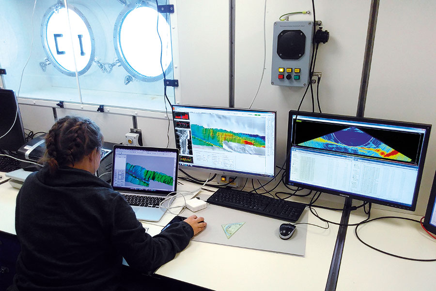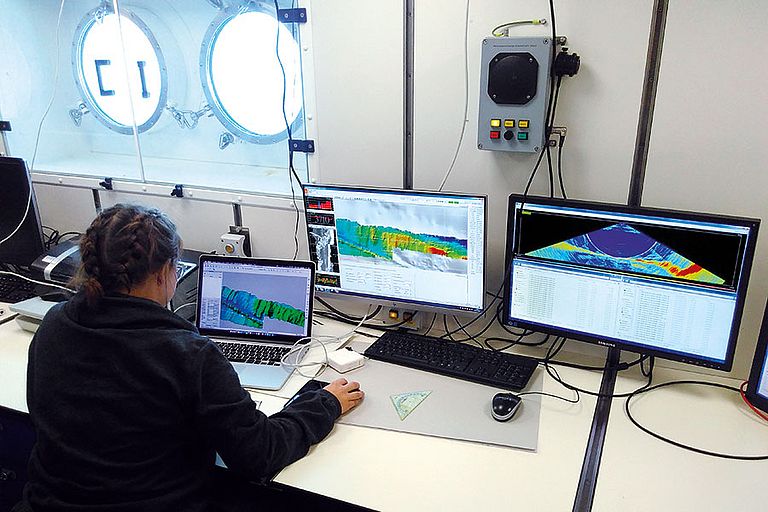 Moderne Weiterentwicklungen der Echolote bilden bis heute die einzige Möglichkeit, den Meeresboden direkt zu vermessen. Auch die MARIA S. MERIAN verfügt über fest installierte Schall-Sender und -Empfänger. Sie schicken nicht mehr nur ein Signal zum Meeresboden und warten auf dessen Echo, sondern fächerförmig gleichzeitig mehrere Hundert. Sie können so einen Streifen Meeresboden kartieren, der bei 4.000 Meter Wassertiefe bis zu 16 Kilometer breit ist. „Das hört sich viel an. Aber bei der gigantischen Fläche der Ozeane sind das nur winzige Ausschnitte“, sagt Anne-Cathrin Wölfl.
