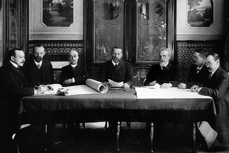 Die erste Ausgabe der „General Bathymetric Chart of the Oceans“ (GEBCO) bildet die Grundlage für eine einheitliche Darstellung der Meerestiefen. Foto des ersten Treffens der internationalen GEBCO Kommission in Wiesbaden im April 1903 mit Beteiligung des Kieler Ozeanographen Otto Krümmel. Quelle: Musée océanographique de Monaco