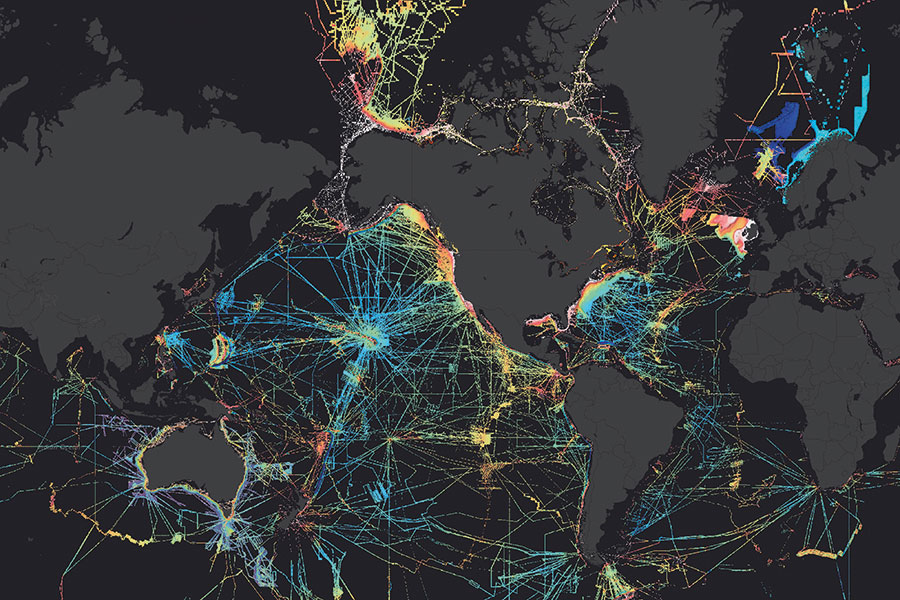 Echolote sind bis heute die einzige Methode, Meeresböden direkt und großflächig zu vermessen. Diese Karte zeigt alle aktuellen Fächerecholotdaten, die über die International Hydrographic Organization frei verfügbar sind. Sie erfassen nur knapp 20 Prozent aller Meeresböden. Das internationale Forschungsprojekt Seabed 2030 hat sich darum das ambitionierte Ziel gesetzt, bis 2030 alle Meeresböden der Erde hochauflösend zu kartieren. Quelle: IHO Data Centre for Digital Bathymetry, https://maps.ngdc.noaa.gov/viewers/iho_dcdb