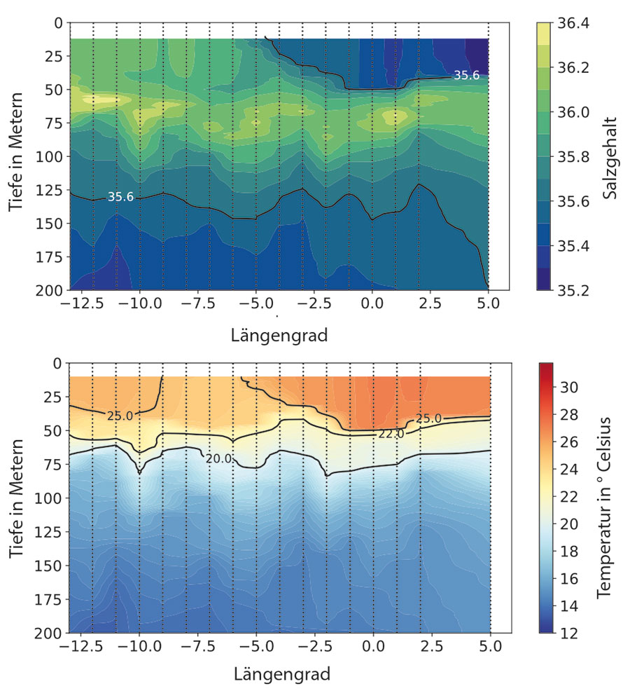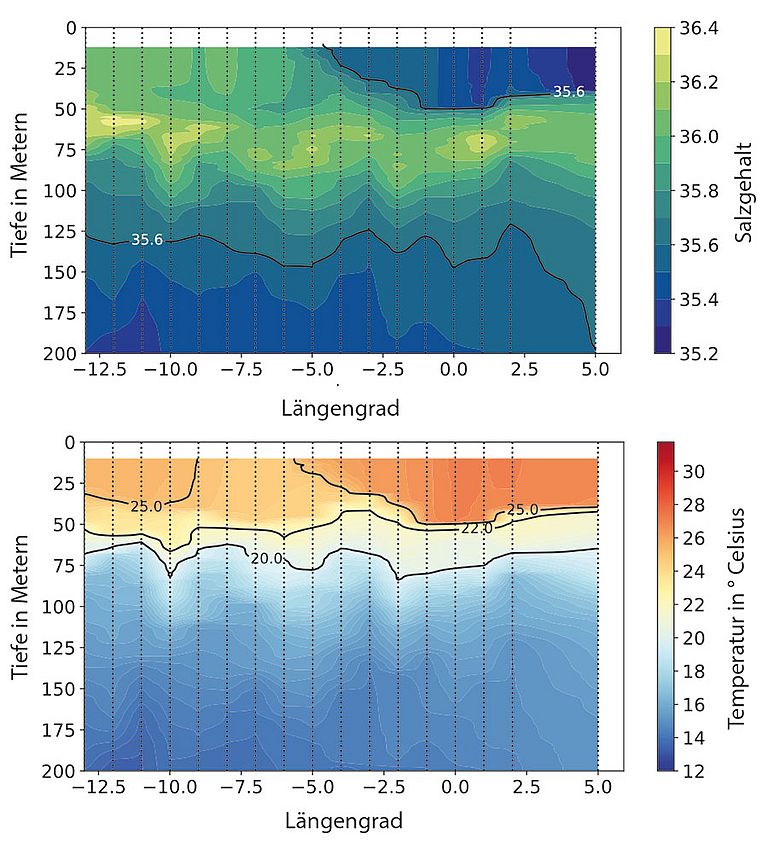 Entlang des Äquators haben die Forscherinnen und Forscher regelmäßig Wasserproben genommen sowie die Physik des Wasser vom Ozeanboden bis zur Oberfläche vermessen. Mit Spezialnetzen und einem Underwater Vision Profiler untersuchten sie das Vorkommen und die Verteilung von Plankton sowie organischer Partikel im Wasser. Bei 23° West bargen sie außerdem eine seit 2001 bestehende Langzeitverankerung, lasen die Daten aus, ersetzten Akkus sowie Verschleißteile und legten die Verankerung wieder aus. „Die Messgeräte haben spektakuläre Tiefenströmungen aufgezeichnet, die ihre Richtung innerhalb weniger hundert Meter von West nach Ost ändern“, berichtet der Fahrtleiter. Schon heute wisse man, dass diese Tiefenströmungen wichtig für die Sauerstoff- und Spurenstoffverteilung am Äquator sind. „Im Detail haben wir aber noch viele Fragen, die wir mit den neuen Daten hoffentlich teilweise beantworten können“, ergänzt Brandt.