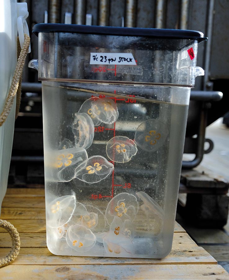 Zusätzlich spielt die ALKOR bei der Ausbildung des wissenschaftlichen Nachwuchses eine nicht zu unterschätzende Rolle. Viele mittlerweile gestandene Professorinnen und Professoren haben ihre ersten Einblicke in die Meeresforschung während einer Praktikumsfahrt auf der ALKOR gewonnen. Auch während der 499. Forschungsreise der ALKOR im August 2017 lernen Studierende des MasterProgramms „Biological Oceanography“ an der Christian-Albrechts-Universität zu Kiel und am GEOMAR die wichtigsten Handgriffe für die Forschung auf See. Sie beproben auf der zweiwöchigen Fahrt Stationen in verschiedenen Regionen der Ostsee. Besonderes Augenmerk liegt auf dem Bornholm Becken, in dem sie an insgesamt 45 Stationen von Bakterien angefangen bis hin zu Quallen und Fischlarvenlarven das Nahrungsnetz untersuchen. Dafür setzen sie unterschiedliche wissenschaftliche Geräte an den festgelegten Positionen aus und üben so deren Einsatz und die Analyse an Bord.
