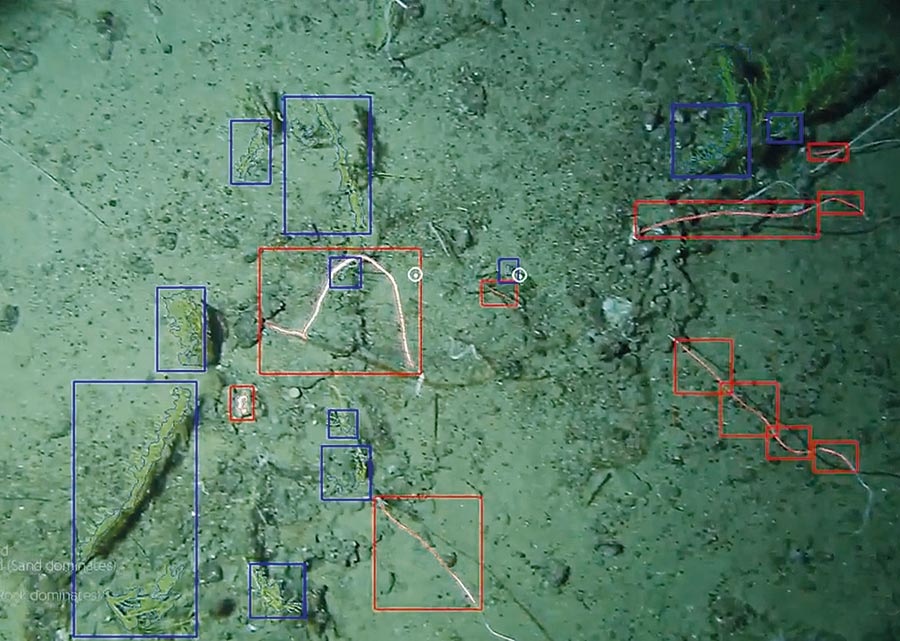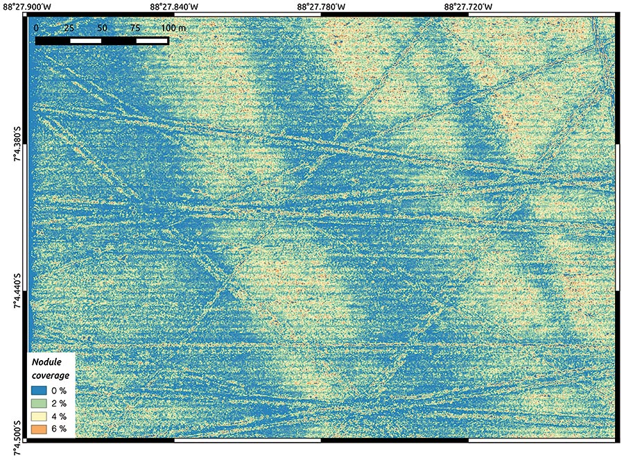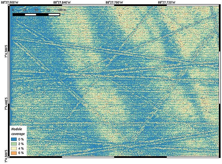 Im Bereich Marine Ressourcen geht es zum einen um eine bessere quantitative Abschätzung vorhandener Ressourcen, wie zum Beispiel Manganknollen, aber auch um die flächige Erfassung von Organismen, die in diesen Gebieten vorkommen. Dazu wird eine Art „Gesichtserkennungverfahren“ entwickelt, mit dessen Hilfe die Manganknollen, aber auch die dort befindlichen Organismen automatisch erkannt werden sollen. „Dazu müssen wir die Software erst mal trainieren, damit möglichst viel automatisch detektiert werden kann“, sagt Jens Greinert. Für die genauere Identifizierung und Klassifizierung von Organismen ist dann aber noch der Mensch weiterhin sehr wichtig. „Wenn man ein Meeresbodenbild mit einer Größe von sieben Fußballfeldern mit einer Auflösung von fünf Millimetern anschauen muss, ist es sehr hilfreich, wenn am Ende des Tages nur noch wenige hundert Einzelbilder für die biologischen Bestimmung der gefundenen Organismen übrig bleiben“, so Greinert weiter. Für die Bestimmung der Organismen wird die Kieler Arbeitsgruppe von englischen Kolleginnen und Kollegen des National Oceanography Centre (NOC) in Southampton im Rahmen des JPI-Oceans Projektes Ecological Aspects of Deep-Sea Mining unterstützt.
