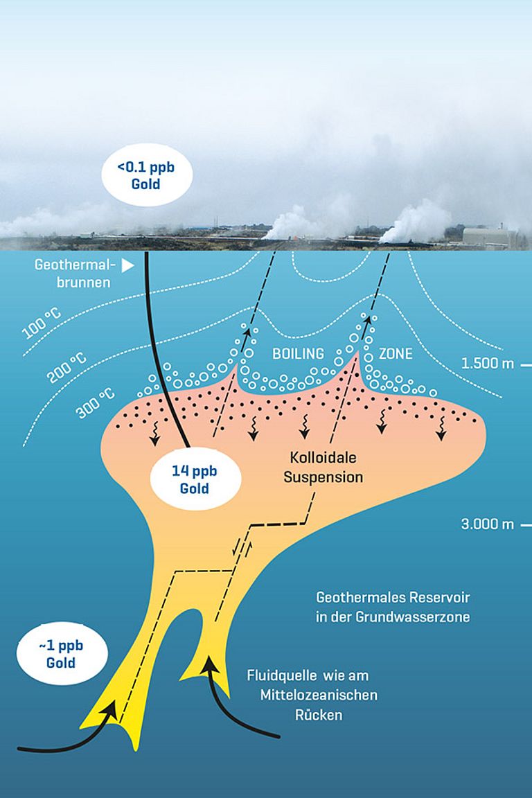 Wie sie in der Fachzeitschrift Nature Geoscience berichten, waren die Konzentrationen 500.000-fach höher als in normalem Meerwasser und mindestens 100-fach höher als an Schwarzen Rauchern in der Tiefsee. „Die Konzentrationen reichen aus, um innerhalb der Lebensdauer eines Geothermalsystems bedeutende Goldlagerstätten zu bilden“, sagt Prof. Dr. Mark Hannington, Erstautor der Studie und Leiter der Arbeitsgruppe Marine Rohstoffforschung am GEOMAR.