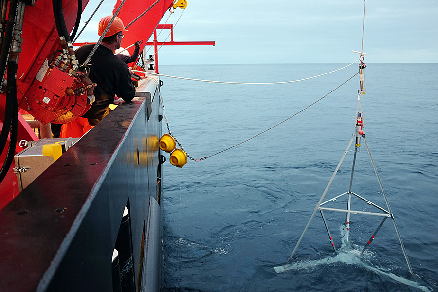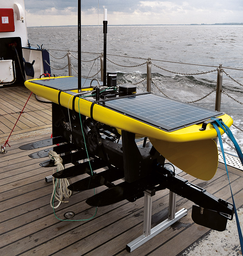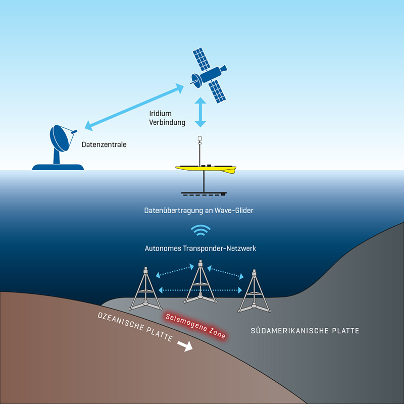 Doch bevor GeoSEA dem Meeresboden vor Nordchile den Puls fühlen kann, war einiges an Vorarbeit nötig: „Wir haben uns in den vergangenen vier Jahren intensiv mit der neuen Technologie und mit der Tektonik in Nordchile befasst“, sagt Dr. Lange. Ein erster Testeinsatz von sechs GeoSEA-Tripoden im Marmarameer läuft seit 2014 erfolgreich. Das Team der SONNE-Expedition SO244/1 unter Leitung von Prof. Dr. Jan Behrmann (GEOMAR) hat schließlich im Oktober und November 2015 mit dem Autonomen Unterwasserfahrzeug AUV ABYSS präzise den Meeresboden vor Nordchile vermessen, um möglichst günstige Standorte für die GeoSEA-Geräte zu finden. Die Tripoden benötigen einen ebenen Standplatz. Der Abstand von zwei Tripoden darf nicht größer sein als eine Seemeile, damit die Abstandsmessung funktioniert, und es dürfen keine Hindernisse dazwischen sein. „Eine echte Herausforderung“, sagt Dr. Lange. Sobald das Messnetz steht, werden die Daten regelmäßig an einen autonomen Wave-Glider übertragen, der sie per Satellit ans GEOMAR weiterleitet.