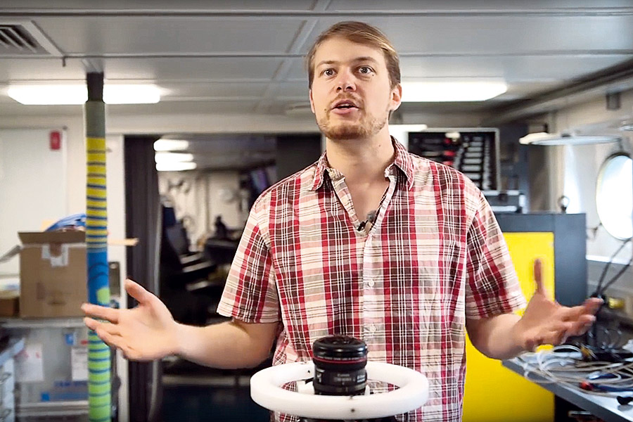 Aber das „Virtual Vents“-Team hat noch mehr verändert. Den Blickwinkel zum Beispiel. Die winzigen Bullaugen von Tiefsee-Tauchbooten wie Alvin, aber auch bisher übliche Kameras an Robotern ermöglichen nur einen recht begrenzten Blick in eine bestimmte Richtung. Wenn man während eines ROV-Tauchgangs nach links oder rechts sehen will, muss der ROV-Pilot die Kameras oder sogar das gesamte Gerät auf Anweisung des Wissenschaftlers entsprechend drehen. Nicht so während der ROPOS-Tauchgänge zum Niua-South-Vulkan: Dafür hatte der Roboter einen eigens im GEOMAR-Technik- und Logistikzentrum gebauten Kamerarahmen mit mehreren Spezialkameras erhalten, die eine 180 Grad Sicht ermöglichten. „Mit Hilfe von Head Mounted Display Datenbrillen konnte jedes Teammitglied an Bord während der Tauchgänge in die Richtung sehen, die es interessierte – so als ob jeder selbst am Meeresboden steht“, berichtet Kwasnitschka, der sich auf Tiefseekameratechnik und Datenvisualisierung spezialisiert hat.