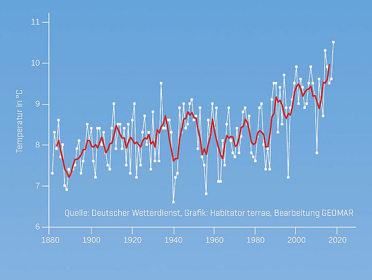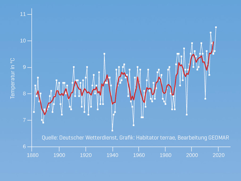 So stieg die Jahresdurchschnittstemperatur in Deutschland seit Beginn der Wetteraufzeichnungen 1881 um 1,3 Grad Celsius. Die globale mittlere Oberflächentemperatur ist im zurückliegenden Jahrhundert um etwa 1 Grad gestiegen. Die Auswirkungen dieser Erwärmung sind bereits sichtbar. Die Gletscher der Polarregionen und Hochgebirge schmelzen, der Meeresspiegel steigt und im größten Korallenriff der Erde, dem australischen Great Barrier Reef, starben in den zwei warmen Sommern 2016 und 2017 rund die Hälfte aller Korallen an Hitzestress. Diese Liste ließe sich beliebig fortsetzen.