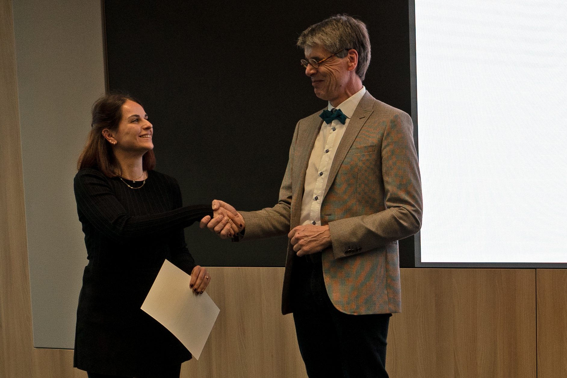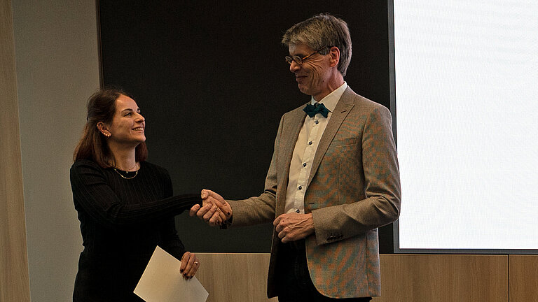 Preisträgerin Dr. Jenna Balaguer nimmt Glückwünsche von Professor Dr. Arne Körtzinger, 1. Vorsitzender der Annette Barthelt-Stiftung, entgegen. Foto: Maike Nicolai, GEOMAR