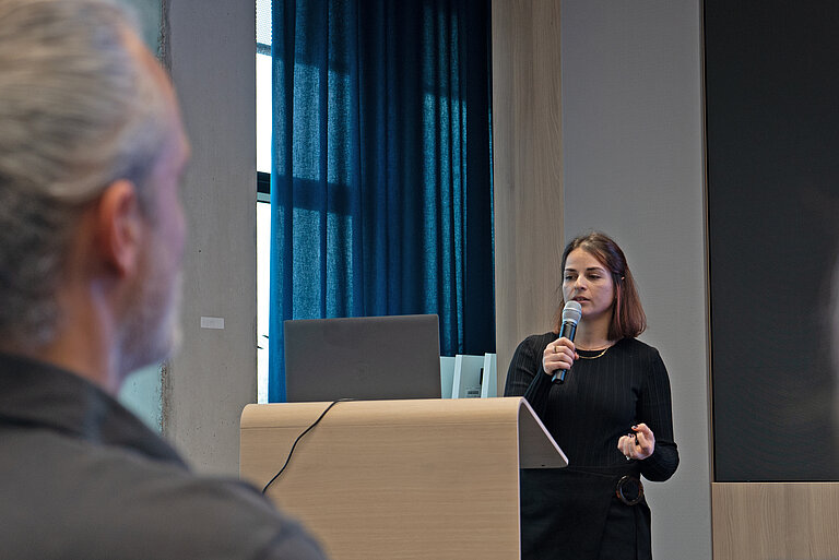 Preisträgerin Dr. Jenna Balaguer präsentiert ihre am Alfred-Wegener-Institut und an der Universität Bremen erstellte Doktorabeit zur Ko-Limitierung von Eisen und Mangan als Einflussfaktor auf die Ökologie des Phytoplanktons im Südlichen Ozean. Foto: Maike Nicolai, GEOMAR