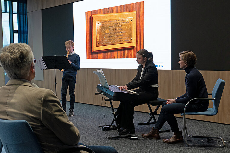 Professor Dr. Arne Körtzinger, 1. Vorsitzender der Annette Barthelt-Stiftung, GEOMAR-Direktorin Professorin Dr. Katja Matthes und Preisträgerin Dr. Jenna Balaguer mit den Musiker:innen Benjamin Wetzig und Vasylysa Martynova (von links). Foto: Maike Nicolai, GEOMAR