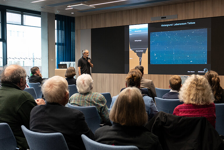 GEOMAR-Meeresbiologe Dr. Jan Dierking stellte im Festvortrag erste Ergebnisse seiner kürzlich beendeten Expedition vor. Foto: Maike Nicolai, GEOMAR