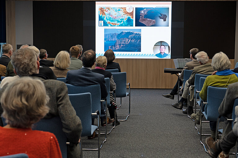 Dr. Jonas Preine konnte nicht an der Preisverleihung teilnehmen und stellte seine an der Universität Hamburg angefertigte Doktorarbeit zur vulkanisch-tektonischen Entwicklung des marinen Vulkanfeldes Christiana-Santorini-Kolumbo per Video vor. Foto: Maike Nicolai