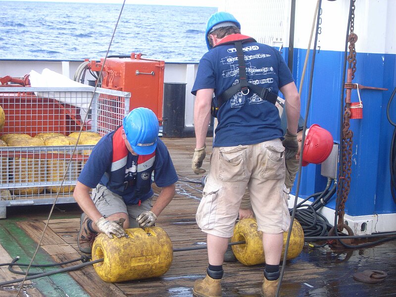 An den äußersten 50 – 70 m des Tiefseekabels, an dem das ROV angeschlagen ist, werden 12 Auftriebskörper befestigt, um das ROV von den Schiffsbewegungen zu entkoppeln und vom Kabel frei zu halten.