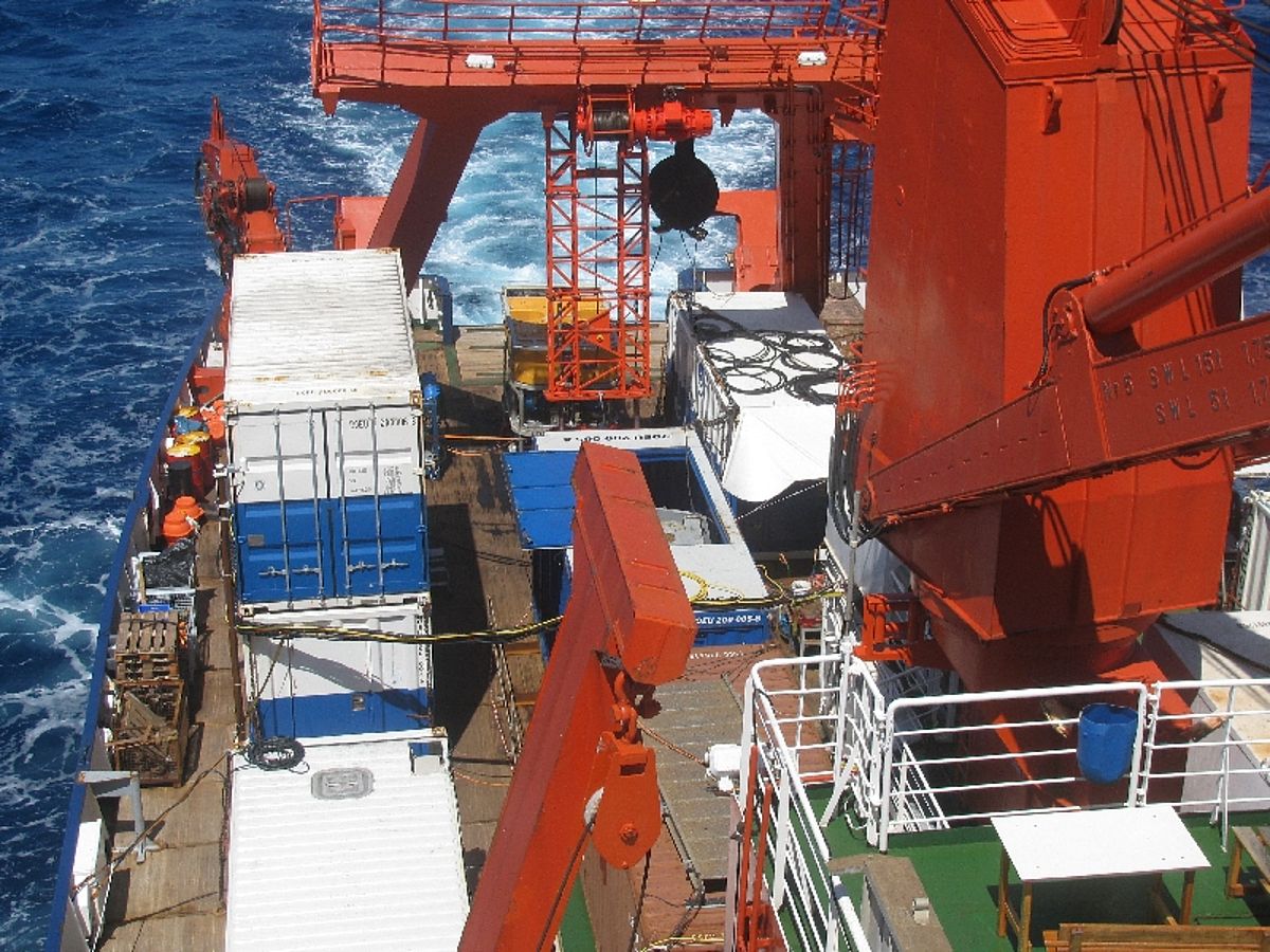 • Deckskapazität zum Aufstellen des Kontroll-, Werkstatt- und Windencontainers (jeweils auf 20' Containerfundamenten) sowie des ROVs