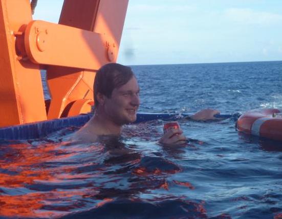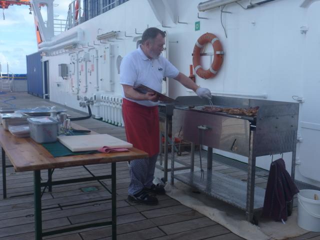 Summer in the southern hemisphere: Thursday's dinner took place on deck, as a barbeque. Chief cook Johann Ennenga and his assistants grilled the self-caught fish from Tristan, along with other delicacies. The ship crew have mounted an ultra-sturdy pool of about 3x3 m^2 on the rear deck, which is regularly refilled with fresh seawater that keeps getting warmer. A perfect way to end the day: in the heaving and rolling water, with a cold beverage, watching the sunset!