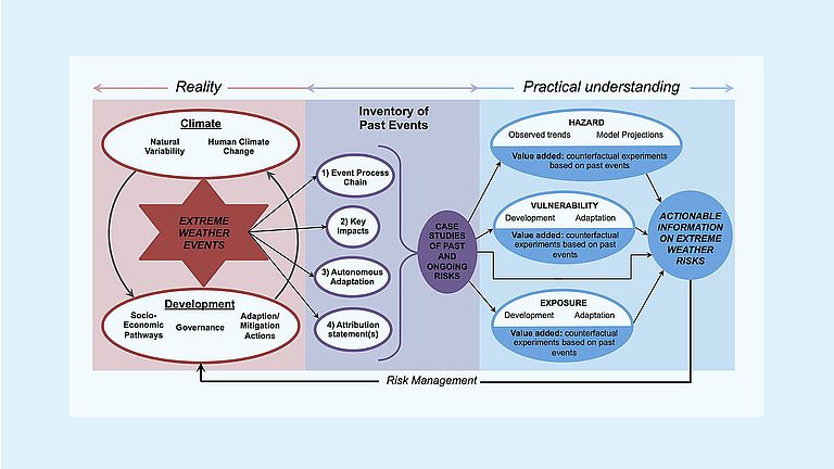 Extremwetterereignisse sind wie eine Lupe, die diese Ungleichheiten sichtbar machen. In Attributionsstudien zeigen wir die verschiedenen Ursachen der Katastrophen, die im Zusammenhang mit Extremwetterereignissen entstehen, auf: