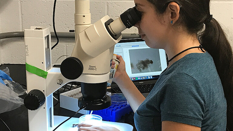 Zuerst müssen wir einzelne sinkende Partikel fangen. Wir haben diese Studien in der Sargassosee südlich von Bermuda durchgefuert, der Teil des Bermuda Atlantic Time-series Study-Standorts (BATS) ist, einer Station im Ozean, die seit 1988 jeden Monat mindestens einmal untersucht wird. Erst kürzlich konnten wir ein Set von Sammlungstuben mit Gelbechern hinzufügen, die es uns ermöglichen, die einzelnen Partikel zu sammeln und verschiedene Partikeltypen zu untersuchen. Wir tun dies durch Mikroskopie und durch Extraktion ihrer DNA, sodass wir einzelne Organismen identifizieren können, die jedem Partikel einen Fingerabdruck seiner Geschichte und seines Schicksals verleihen. Wir haben zum Beispiel herausgefunden, dass alle in dieser Region gesammelten Partikel von Zooplankton bearbeitet wurden. Wir wissen das, weil wir Bakterien in den Partikeln gefunden haben, die Teil des Zooplankton Mikrobioms sind. Diese Studien haben auch auf die Bedeutung des ansässigen Zooplanktons hingewiesen, das derzeit ein Forschungsschwerpunkt in meiner Arbeitsgruppe ist.