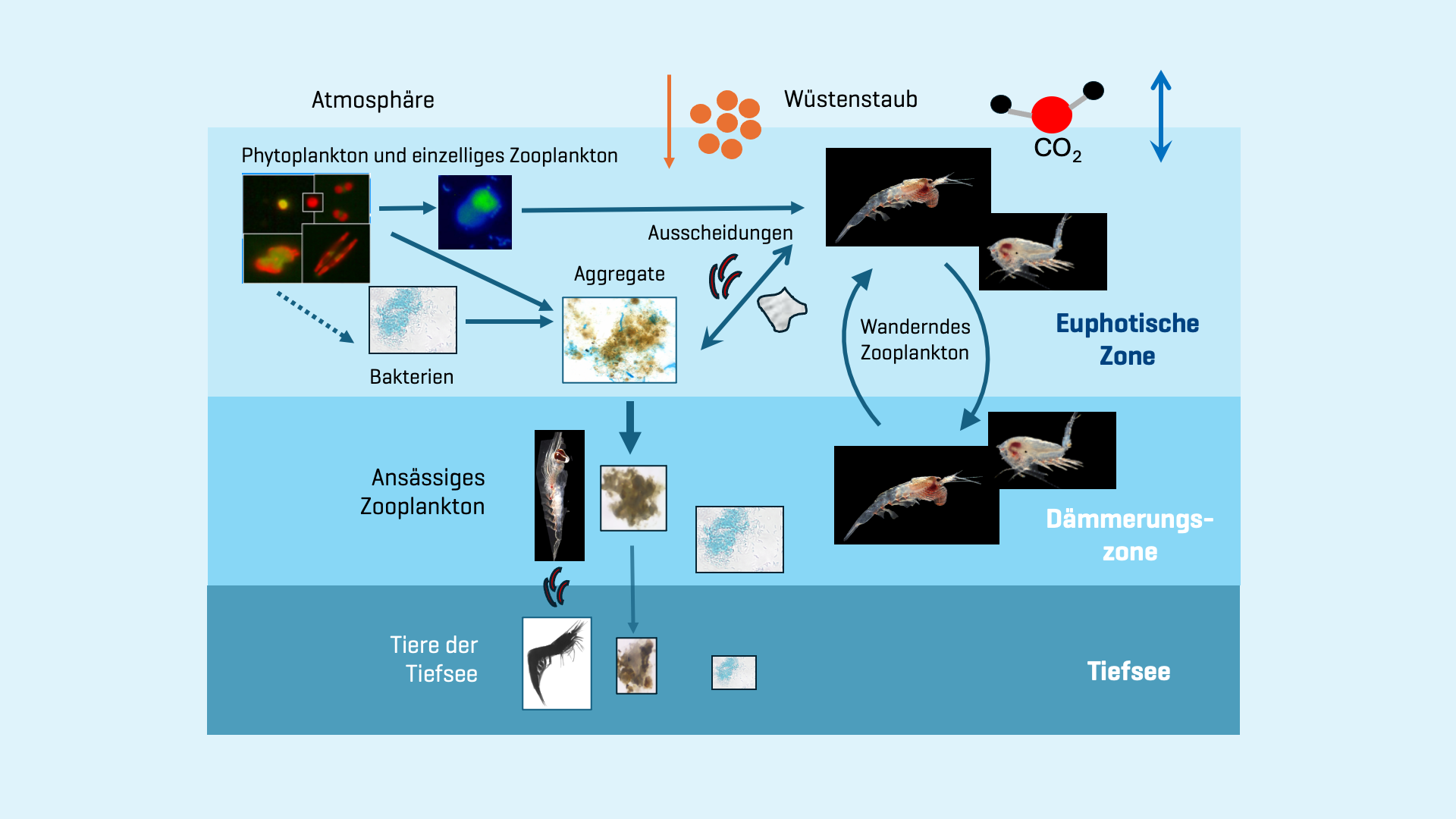 Die planktonischen Krebstiere wie Ruderfusskrebse und Krill, die sich von Phytoplankton ernähren, sind in der Tat wichtige Vermittler der biologischen Kohlenstoffpumpe. Durch das Verpacken der Phytoplanktonbeute in Ausscheidungen, die in tiefere Gewässer sinken, erleichtert das Zooplankton den Transfer von Kohlenstoff in den tiefen Ozean. Unter dem Zooplankton gibt es wandernde Tiere, die lange Migrationen durchführen und die Nacht in der Oberfläche verbringen, wo sie sich von Phytoplankton ernähren, aber dann tagsüber in die Dämmerungszone des Ozeans abtauchen. Dies sind die größten Tierwanderungen, die auf der Erde bekannt sind. Diese Wanderer bringen ihre Nahrung in die Tiefe, und entfernen somit aktiv organischen Kohlenstoff. Es gibt aber auch ansässiges Zooplankton, das einfach unterhalb der euphotischen Zone sitzt und sinkende Partikel auffängt. Innerhalb der Dämmerungszone verpacken und modifizieren diese kleinen planktonischen Tiere anschließend den Regen von Partikeln.