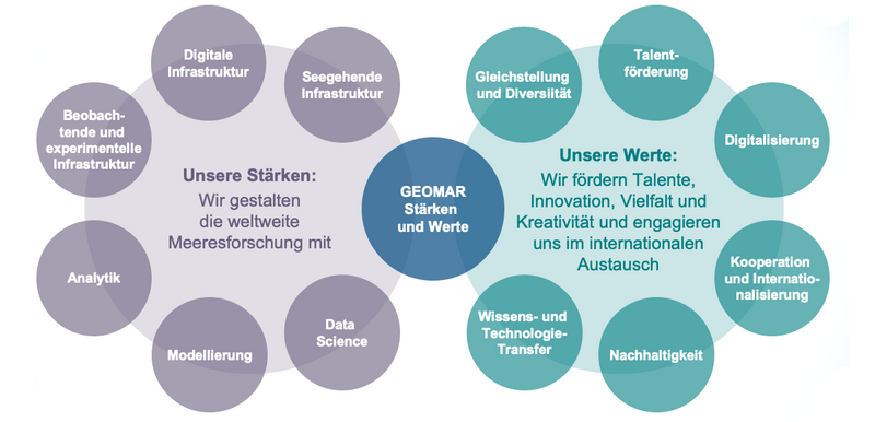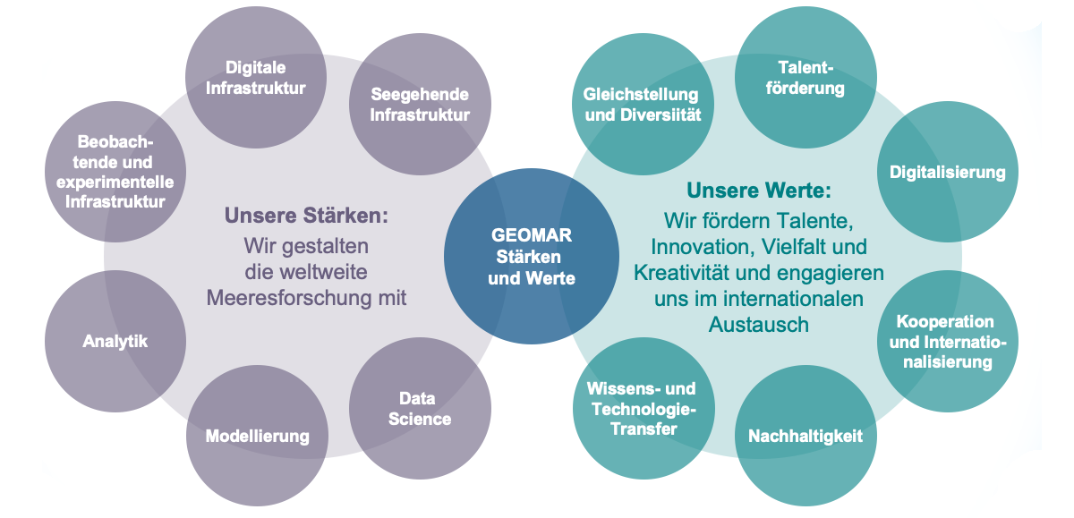 Die Forschung wird durch die Werte und Stärken des Zentrums unterstützt. Hierzu zählen Gleichstellung und Diversität, Kooperation und Internationalisierung, Talentförderung, Wissens- und Technologietransfer, Digitalisierung und Nachhaltigkeit sowie Modellierung, Analytik, Seegehende Infrastruktur, Beobachtende und Experimentelle Infrastruktur, Digitale Infrastruktur und Data Science.